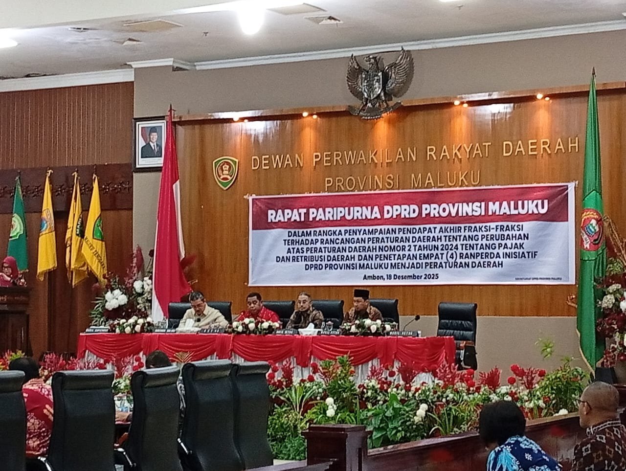 AMBON,MM. – DPRD Provinsi Maluku resmi menetapkan empat Rancangan Peraturan Daerah (Ranperda) inisiatif DPRD menjadi Peraturan Daerah (Perda), sekaligus mempercepat pembahasan Ranperda tentang perubahan atas Perda Nomor 2 Tahun 2024 tentang Pajak dan Retribusi Daerah. Penetapan tersebut dilakukan dalam rapat paripurna DPRD Maluku yang digelar di ruang rapat paripurna, Kamis (18/12/2025).