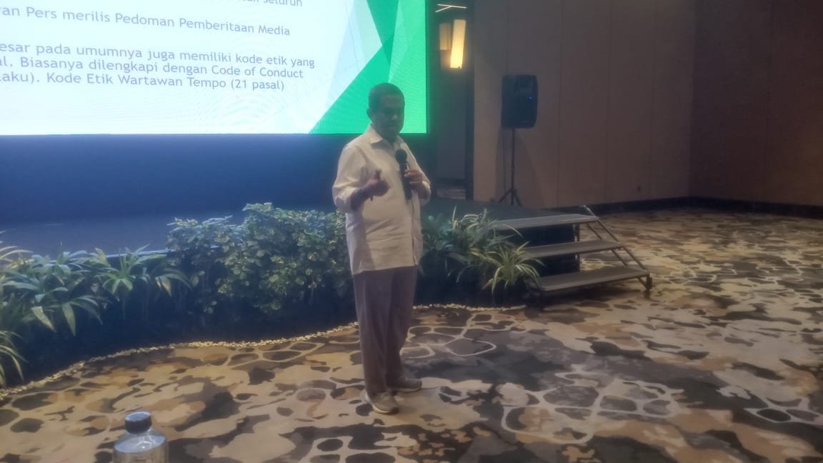 Ia mengawali sharing nya sembari mengatakan, jurnalis adalah sebuah profesi dimana dalam bekerja jurnalis memiliki kompetensi tertentu serta bekerja dengan panduan Kode Etik Jurnalistik.