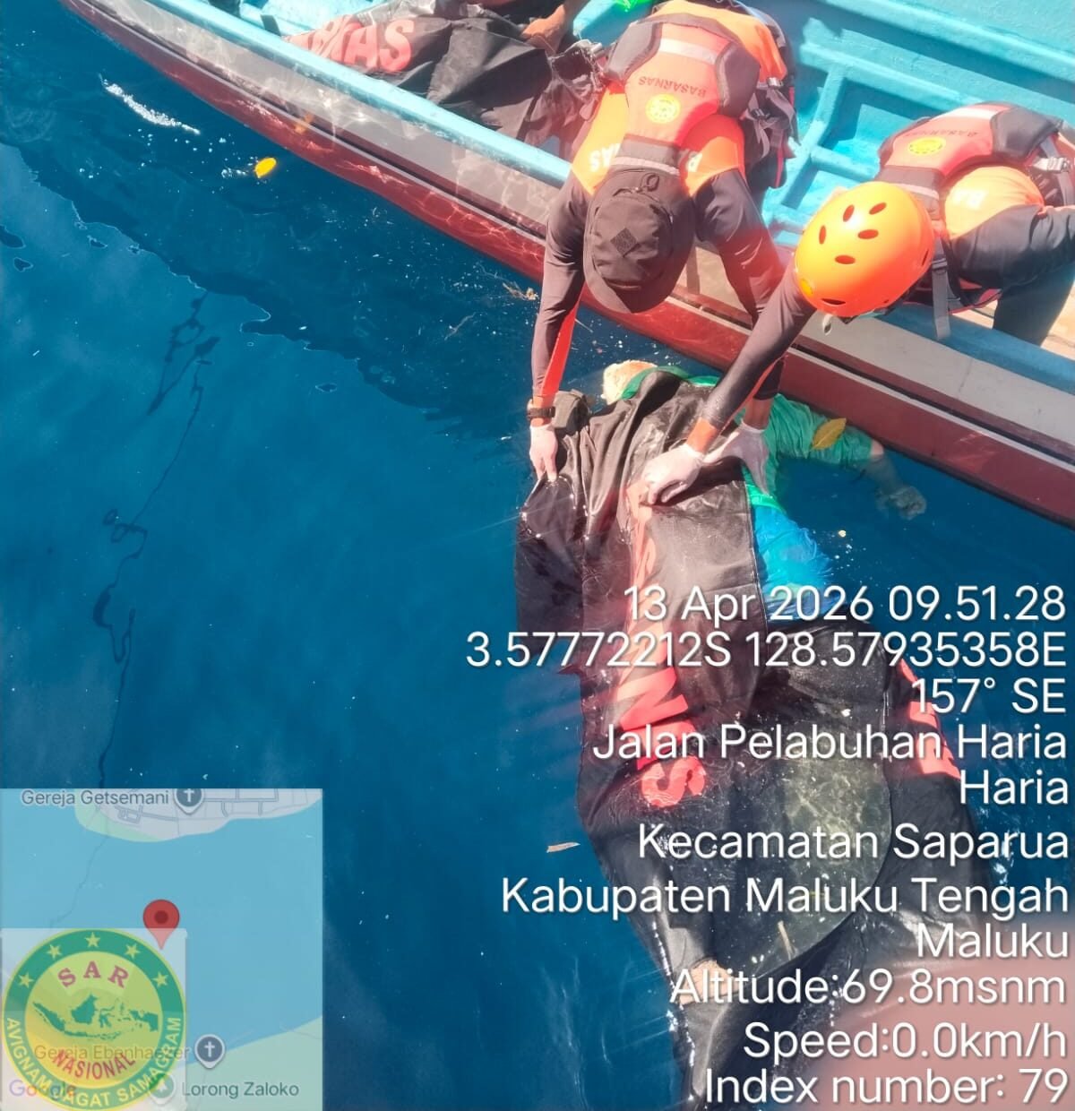 Korban ditemukan pada jarak sekitar 2,4 nautical mile dari lokasi kejadian awal. Selanjutnya, jenazah dievakuasi menuju Desa Haria untuk diserahkan kepada pihak keluarga.