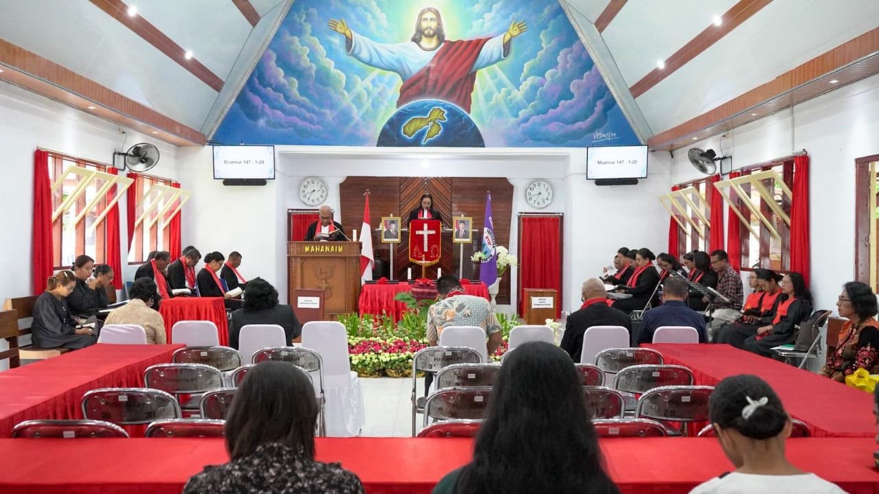 AMBON,MM. – Inspektur Komando Daerah Angkatan Laut lX (lrkodaeral IX), Kolonel Marinir Eko Priyo Handoyo mewakili Komandan Kodaeral IX, Laksamana Muda TNI Hanarko Djodi Pamungkas, S.H., menghadiri undangan Persidangan ke – 32 Jemaat Kategorial TNI Angkatan Laut di Gereja Mahanaim Kodaeral IX, Halong, Kota Ambon, Maluku, Minggu (25/1/2026).