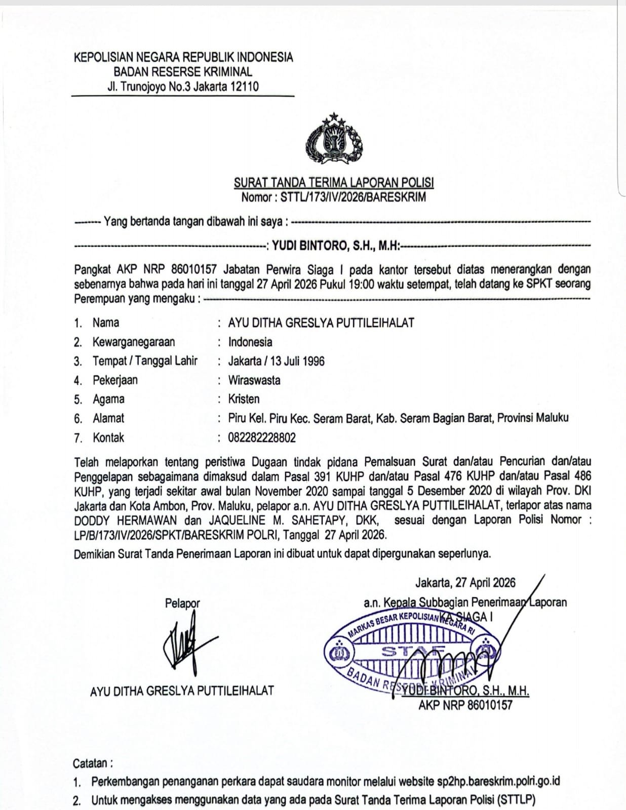 Laporan tersebut teregistrasi dalam Surat Tanda Terima Laporan Polisi (STTLP) Nomor: STTL/173/IV/2026/BARESKRIM tertanggal 27 April 2026.