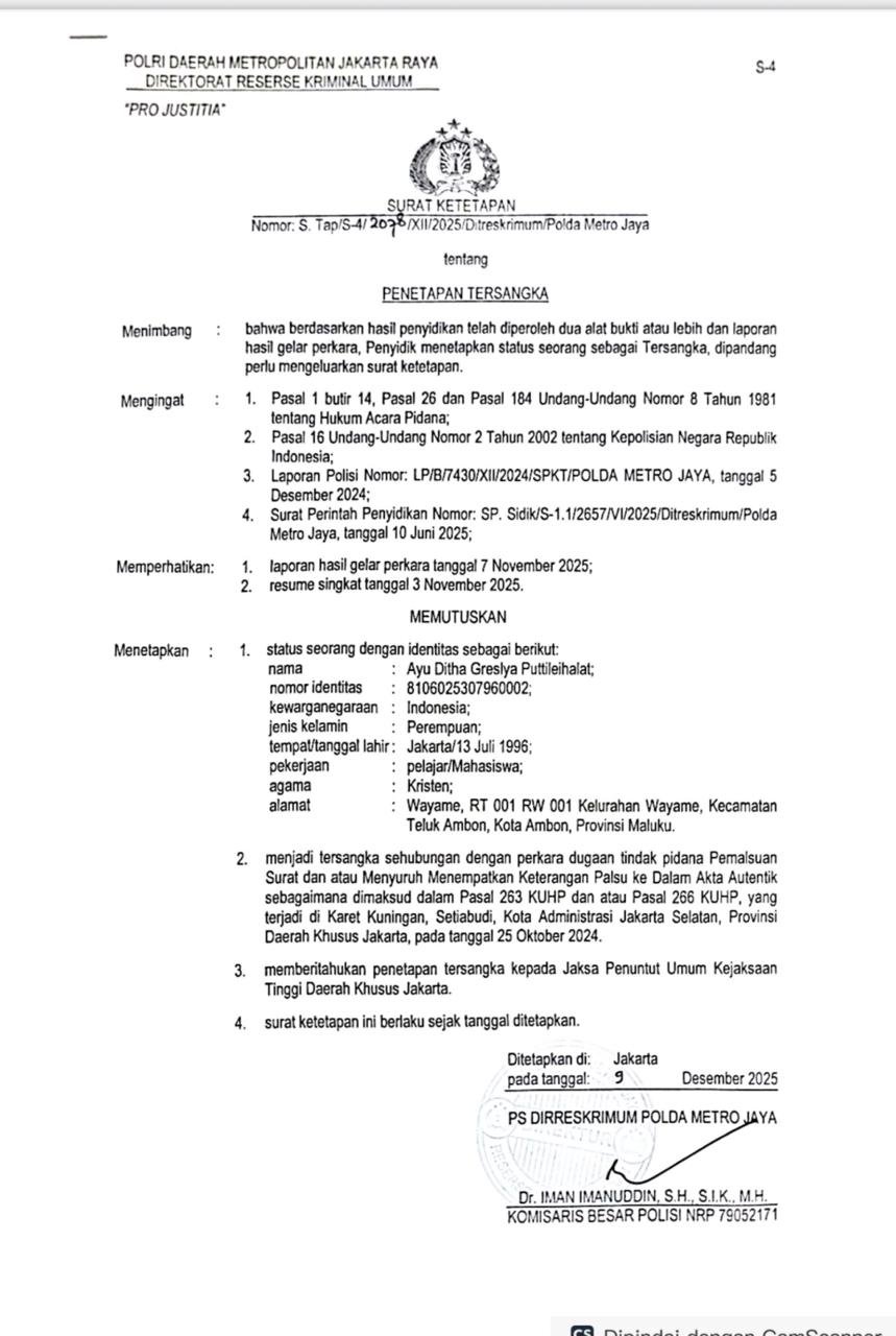 Ayu Ditha Greslya Puttileihalat ditetapkan sebagai tersangka oleh penyidik Polda Metro Jaya berdasarkan Surat Ketetapan Nomor S.Tap/S-4/2078/XII/2025/Ditreskrimum/Polda Metro Jaya tertanggal 9 Desember 2025.