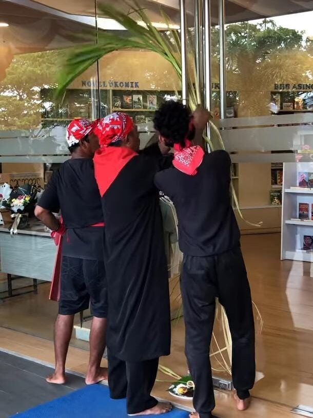 Dalam prosesi adat, mereka memasang sasi berupa tombak kelapa di pintu masuk Supermarket Dian Pertiwi sebagai tanda tutup sementara toko tersebut,  sampai persoalan sengketa lahan tuntas. Prosesi adat berjalan dengan tertib dan tanpa ada perlawanan dari pihak Supermarket Dian Pertiwi.
