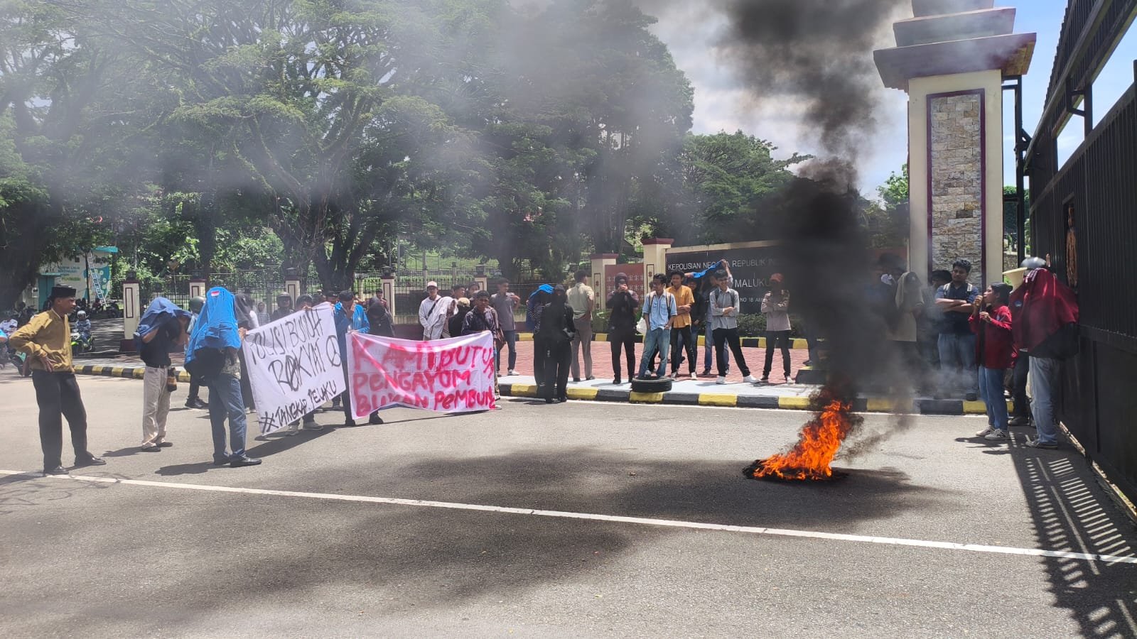 Dalam aksi tersebut, massa melakukan pembakaran ban bekas sebagai simbol perlawanan dan kemarahan kolektif. Sejumlah orator menyuarakan kritik keras terhadap institusi
