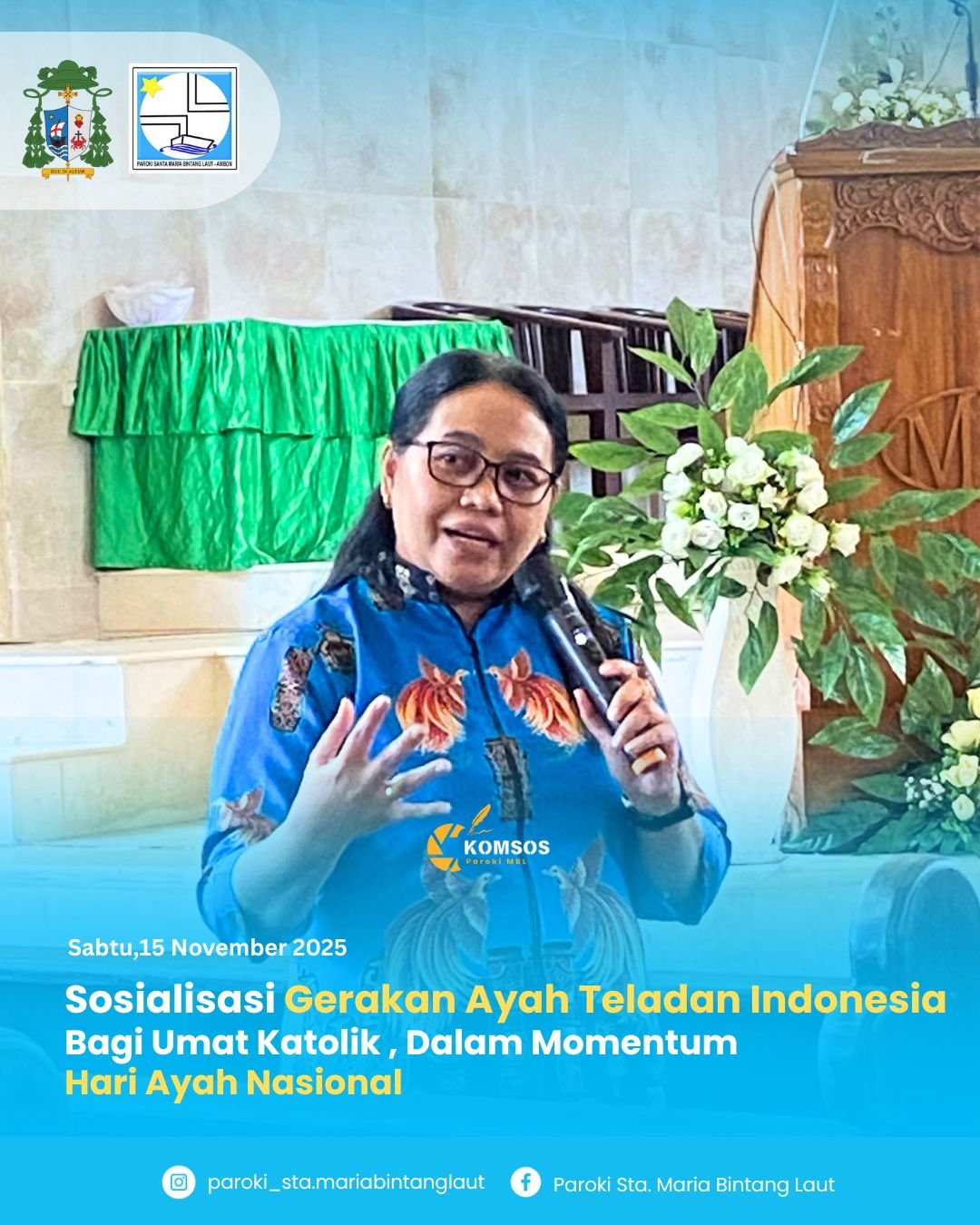 AMBON,MM. – Badan Kependudukan Keluarga Berencana Nasional Provinsi Maluku bekerjasama dengan paroki Maria Bintang Laut Ambon menyelenggarakan sosialisasi gerakan Ayah Teladan Indonesia dengan melibatkan 100 Kaum Bapak dan OMK yang berasal dari Paroki Santa Maria Bintang Laut (MBL) Benteng dan paroki Hati Kudus Yesus (HKY) Batu Gantung Ambon, Sabtu, 15/11/2025 di gedung Gereja MBL Benteng Ambon.