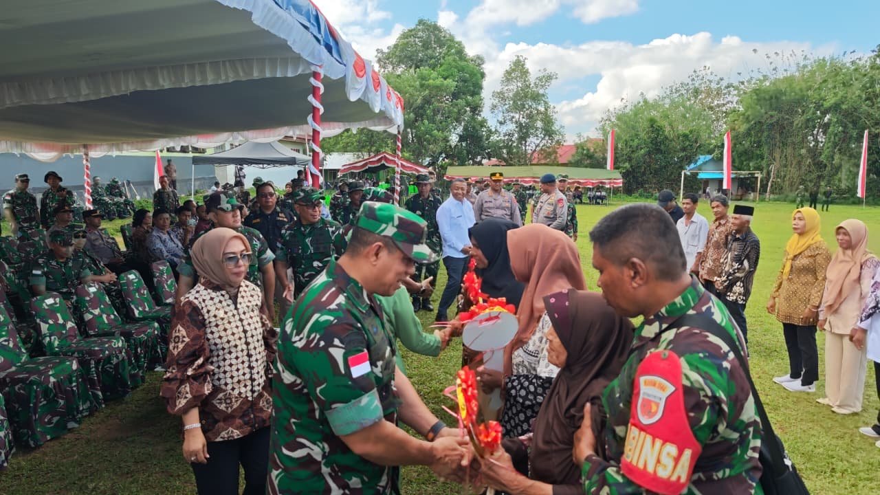 Selain itu, pembagian paket sembako turut dilakukan kepada masyarakat kurang mampu di sekitar lokasi kegiatan, sebagai bentuk kepedulian sosial TNI terhadap rakyat.